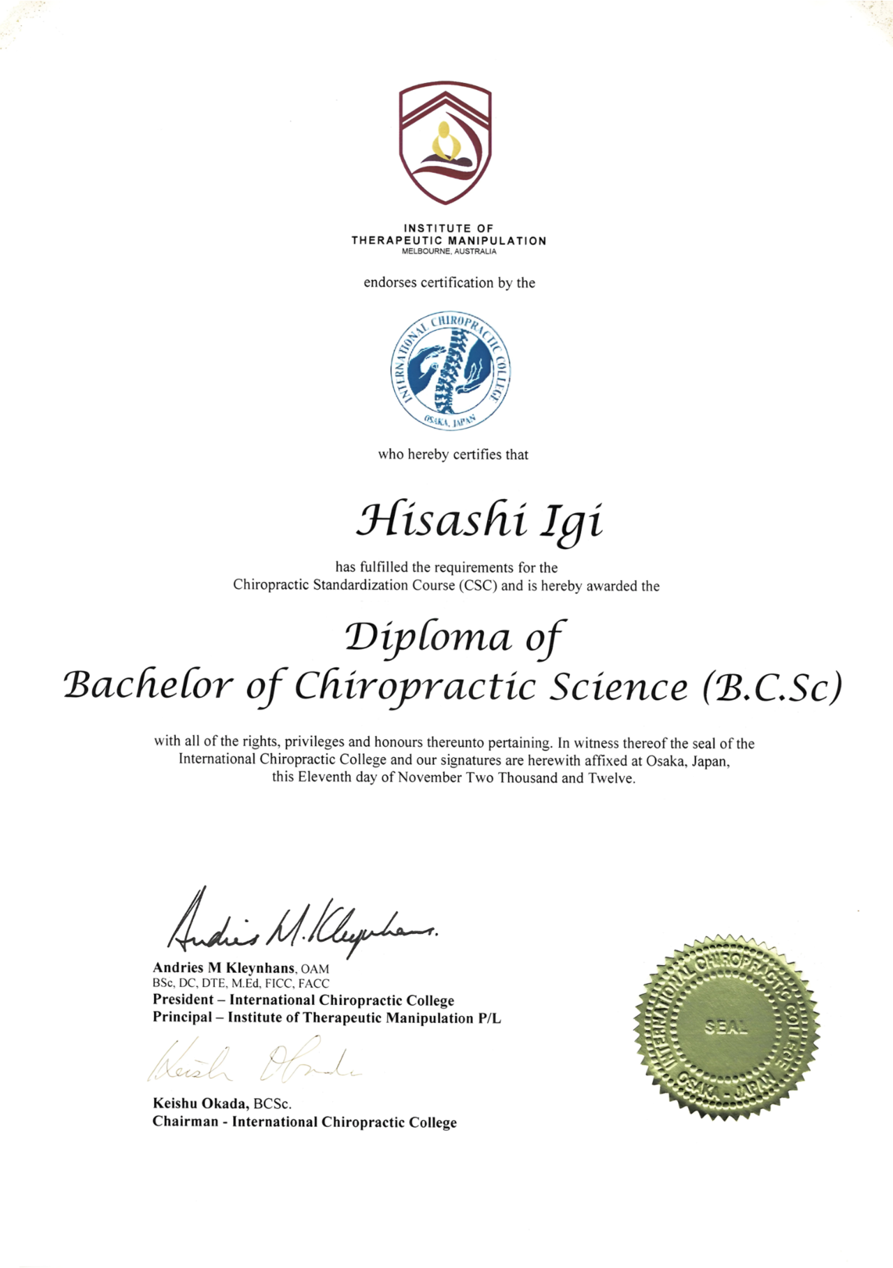WHO(世界保健機関)が定めた教育ガイドラインを修了し、「カイロプラクティック理学士」(B.C.Sc Diploma)を取得しています。