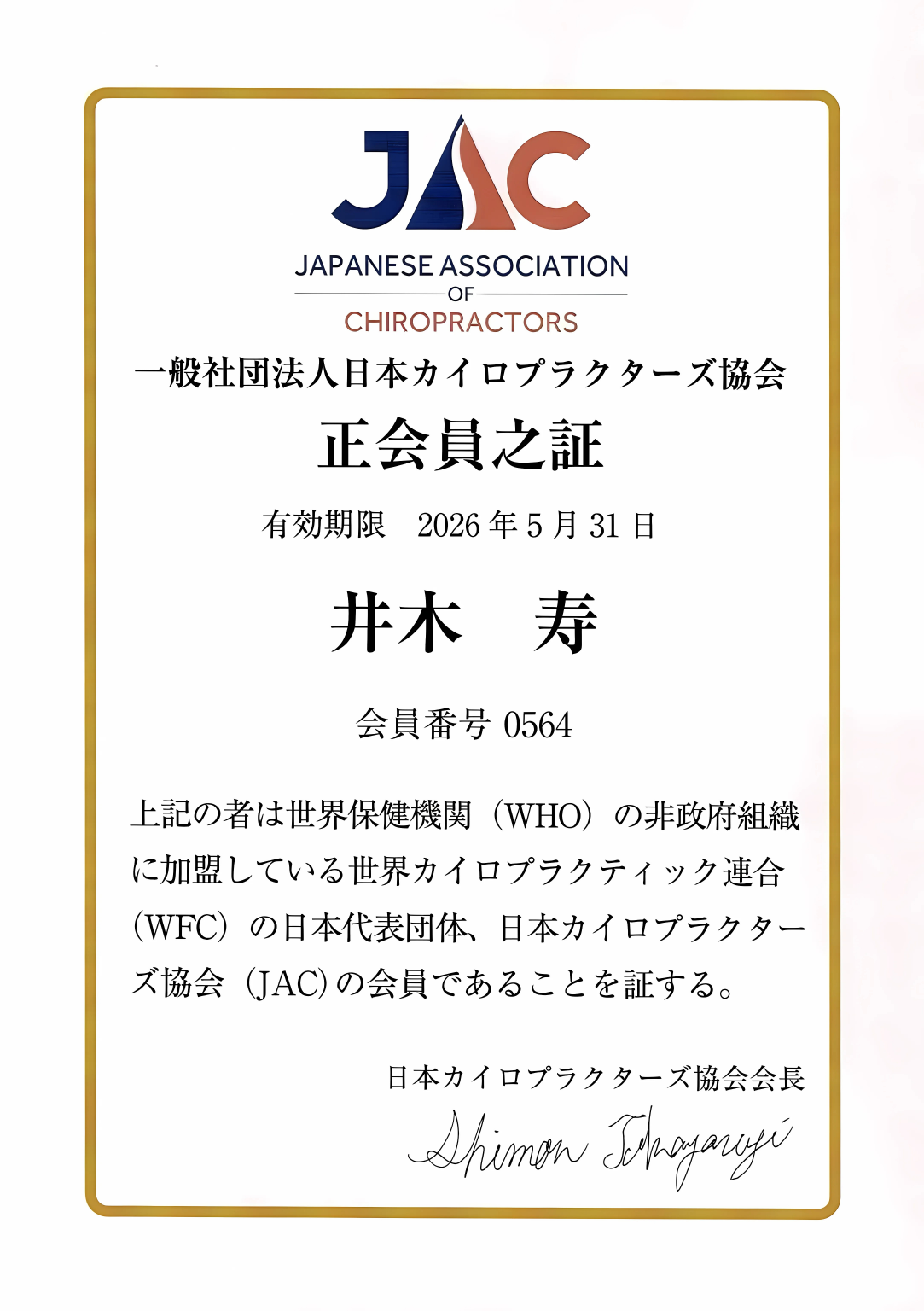 ・日本カイロプラクターズ協会 正会員 WHO承認WFC 日本唯一の代表加盟団体